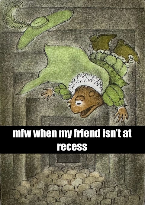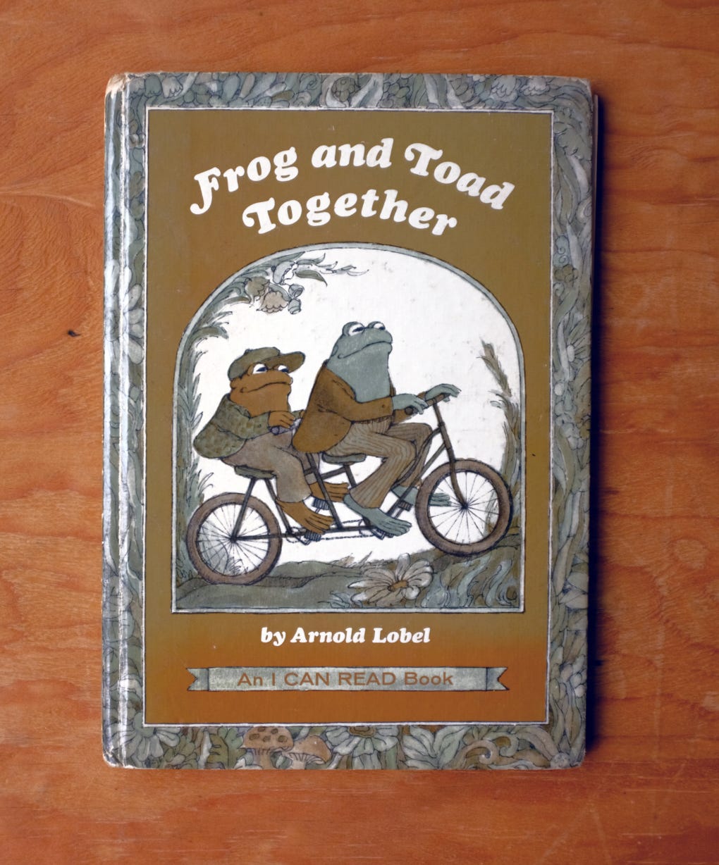 I’ve read these books to a lot of little kids in the last year and this is my favorite Frog and Toad story (usually someone *gasps* when I get to the “SHUT UP”)—something I’ve been thinking about is how much more *interiority* Toad has and how maybe actually Frog doesn’t have much going on without Toad? Like maybe actually Frog is sitting around a lot of the day waiting for Toad to hang out; maybe he always comes over because Toad’s Toadness is giving him something he otherwise doesn’t have.